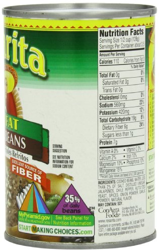 Nutrition Facts for Rosarita Vegetarian Refried Beans - MyFoodDiary Nutrition Facts Serving Size 16-oz can Amount Per Serving 385 Calories % Daily Value* 14% Total Fat 8.8g 0% Saturated Fat 0g Trans Fat 0g 0% Cholesterol 0mg 88% Sodium 2030mg 19% Total Carbohydrate 56g 63% Dietary Fiber 17.5g Total Sugars 1.8g 0% Includes 0g Added Sugars Protein 17.5g 0% Vitamin D 0mcg 0% Calcium 0mg 27% Iron 4.9mg Rosarita Black Beans, Refried, Low Fat: Calories, Nutrition Analysis ... Ingredients: 2 cups diced fresh mango 2 cups black beans, rinsed and drained, if canned 1/2 cup diced red onion 1 to 2 tablespoons finely chopped, seeded jalapeno pepper 2 tablespoons chopped fresh cilantro 2 tablespoons lime juice 1/2 teaspoon salt Instructions: In a medium bowl, combine all ingredients. Per serving (1/4 cup): 69 calories; 14 ... Nutrition Facts for Rosarita Organic Refried Beans Nutrition Facts Serving Size 16-oz can Amount Per Serving 385 Calories % Daily Value* 11% Total Fat7g 26%Saturated Fat5.2g Trans Fat0g 0% Cholesterol0mg 84% Sodium1925mg 20% Total Carbohydrate59.5g 75% Dietary Fiber21g Total Sugars1.8g 0% Includes 0g Added Sugars Protein17.5g 0%Vitamin D0mcg 0%Calcium0mg