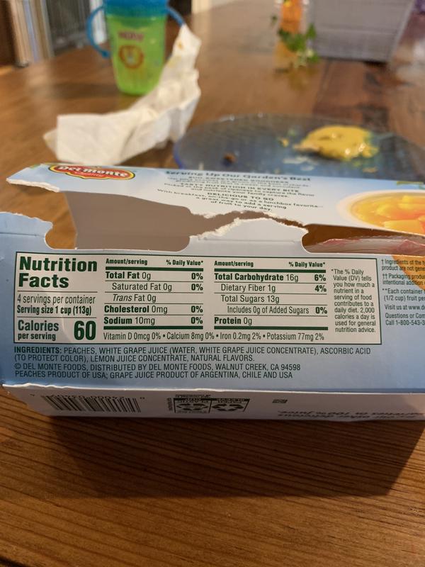 Dole - Peach Fruit Cup calories, carbs & nutrition facts - MyFitnessPal 1 cup 80 Cal 95% 19g Carbs 0% -- Fat 5% 1g Protein Track macros, calories, and more with MyFitnessPal. Join for free! Daily Goals How does this food fit into your daily goals? Calorie Goal 1920 Cal 80/2000Cal left Fitness Goals: Heart Healthy Fat 67 g --/67g left Sodium 2295 mg 5/2300mg left Cholesterol 300 mg --/300mg left Nutritional Info Carbs