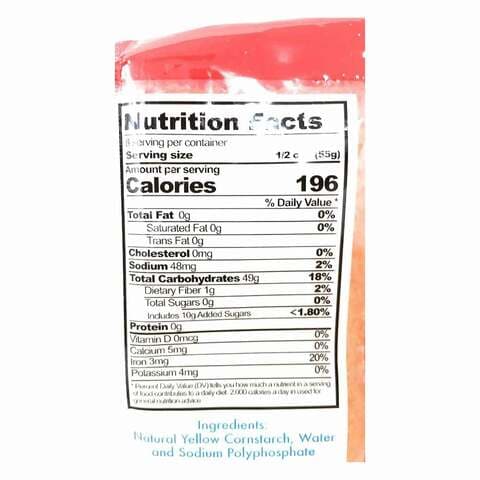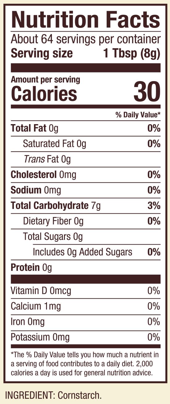 Cornstarch nutrition facts and analysis. The latter is 0 g sugar and 1.2 g of dietary fiber, the rest is complex carbohydrate. Cornstarch contains 0 g of saturated fat and 0 mg of cholesterol per serving. 128 g of Cornstarch contains 0.00 mcg vitamin A, 0.0 mg vitamin C, 0.00 mcg vitamin D as well as 0.60 mg of iron, 2.56 mg of calcium, 3.8 mg of potassium. What Is Cornstarch? - The Spruce Eats Cornstarch is made from corn and only contains carbohydrates (no protein), so it is a gluten -free product. For this reason, cornstarch is an excellent gluten-free alternative to flour thickeners in gravy and sauce recipes. It's often preferred over flour as a thickener because the resulting gel is transparent, rather than opaque. Cornstarch Nutrition Facts and Health Benefits - Verywell Fit The following nutrition information is provided by the USDA for a one-tablespoon serving (8 grams) of cornstarch. 1 Calories: 30 Fat: 0g Sodium: 0mg Carbs: 7g Fiber: 0g Sugars: 0g Protein: 0g Carbs Cornstarch provides about 30 calories per tablespoon, primarily from carbohydrates. Is Cornstarch Gluten Free? - Does This Have Gluten As with cornstarch, be sure to read the ingredients label to ensure the brands you are looking at are gluten free. The following can be used in place of cornstarch: Potato Starch Tapioca Starch Gluten Free Cornstarch Brands: You can find these brands of gluten free cornstarch in almost all grocery stores, and mail order stores like Thrive Market.