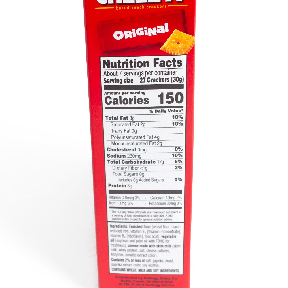 Cheez It Nutrition Facts Label, Calories and Ingredients - Health Coach Jp Cheez Its Food Label Cheez-Its are a cheese-flavored, baked snack cracker manufactured by Kellogg's. They were introduced in 1921 and are currently available in several different flavors. The ingredients listed on the food label include enriched flour, vegetable oil, salt, cheddar cheese, whey, etc. Pictures of Cheez Its