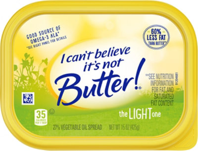 I Can't Believe It's Not Butter! Light Buttery Spread - 15oz I Can't Believe It's Not Butter!® Light spread contains 4g fat (1g saturated fat, 0g trans fat) and 35 calories per serving. 0G TRANS FAT PER SERVING: and NO hydrogenated or partially hydrogenated oils. READY TO SPREAD: straight from the fridge to your plate. No need to soften or melt first. Specifications Contains: Soy Features: Non-GMO
