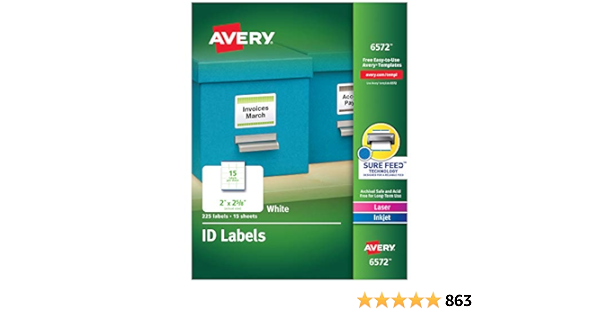 Avery ID Labels, Sure Feed Technology, Permanent Adhesive, 1.25" x 1.75 ... This item: Avery ID Labels, Sure Feed Technology, Permanent Adhesive, 1.25" x 1.75", 480 Labels (6570) $8.98 ($0.02/Count) Avery ID Labels, Sure Feed Technology, Permanent Adhesive, 2" x 2-5/8", 225 Labels (6572) $12.50 ($0.06/Count) Avery Square Labels for Laser & Inkjet Printers, Sure Feed, 2" x 2", 300 White Labels (22806) $15.89 ($0.05/Count)