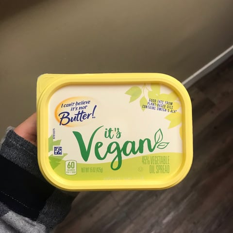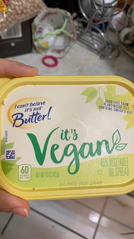 I Cant Believe Its Not Butter Spread Vegetable Oil 45% Its Vegan - 15 ... Compared to dairy butter, I Can't Believe It's Not Butter! Vegan Spread has less saturated fat, fewer calories, and more Omega-3 ALAs. 375mg of Omega-3 ALA (23% of the 1.6g daily value) compared to 44mg (1.1% of the 1.6g daily value) contained in dairy butter to be exact. Made with simple ingredients such as a delicious blend of plant-based ...